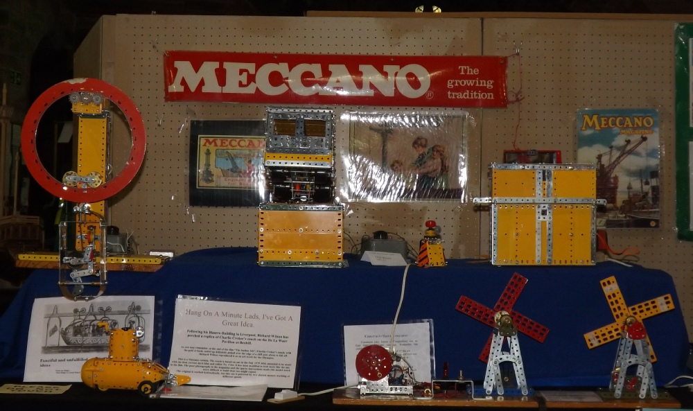 Unfortunately, only 5 members were able to attend but, nevertheless were able to fill 10 tables with models and used 2 more for a Hands-On Workshop. We had a few problems with an electricity virus which caused Neville to exhibit a model of a Union Pacific Locomotive Repair Shop rather than a working locomotive and delays in getting Dick’s Kangaroo Crane to work. Derrick’s Lowry Bridge went up and down a good number of times. The Chairman of the the Friends of the Church was pleased to see that the model of the Märklin Ship (see the Masham report for a picture) had a Blue Funnel, which was very familiar to him. (The Blue Funnel Line operated out of Liverpool)